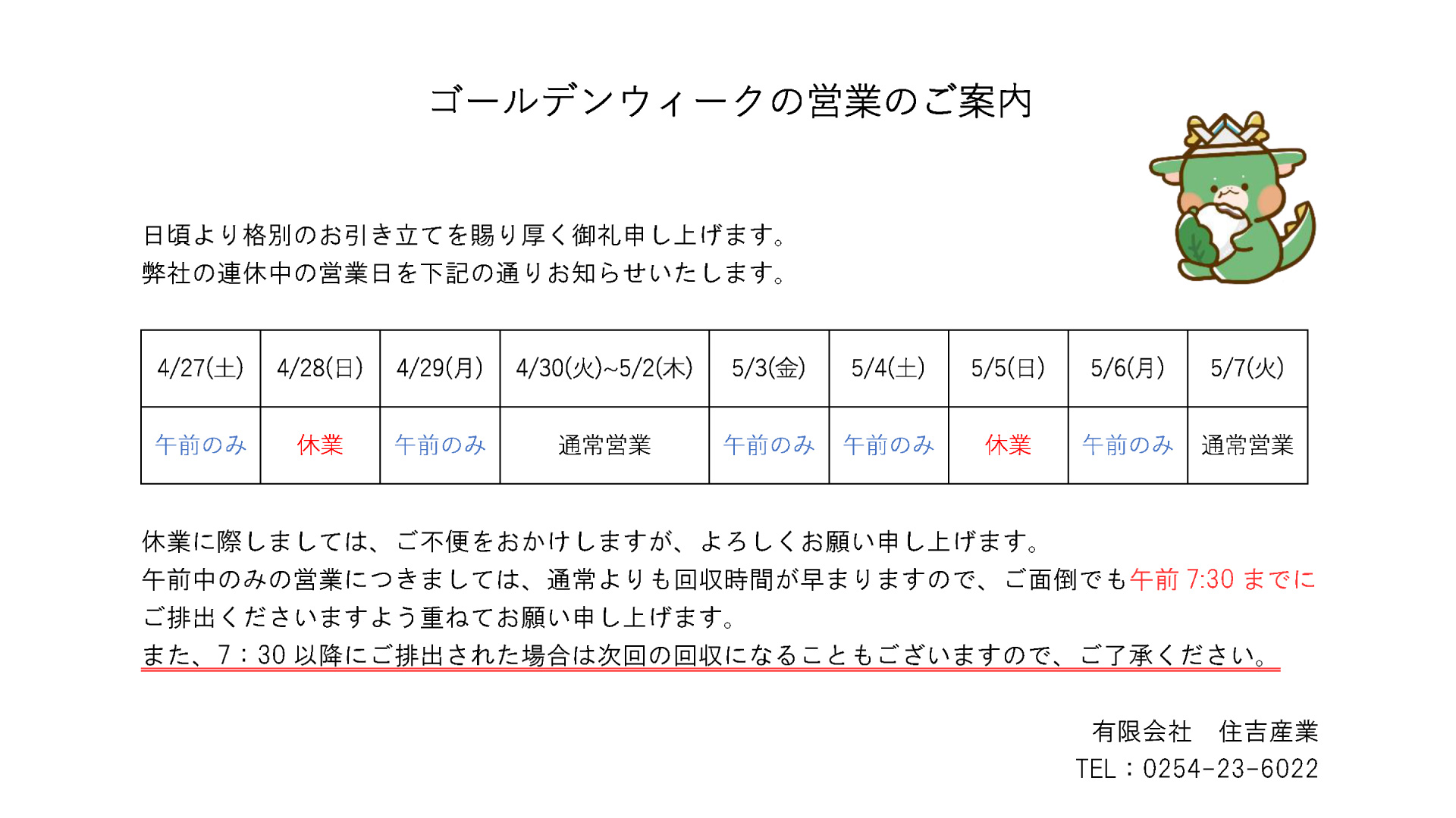 <事業系定期回収のお客様へ> 2024年ゴールデンウィーク期間中の営業日のお知らせ