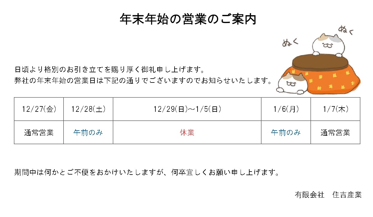 HOME > お知らせ > お知らせ 2024年 年末年始の営業時間について 2024年11月27日 日頃より格別のお引き立てを賜り、厚く御礼申し上げます。 年末年始期間の営業について下記の通りご案内いたします。 期間中はご不便をおかけいたしますが、何卒よろしくお願い申し上げます。 ▼クリックして保存・印刷することもできます▼